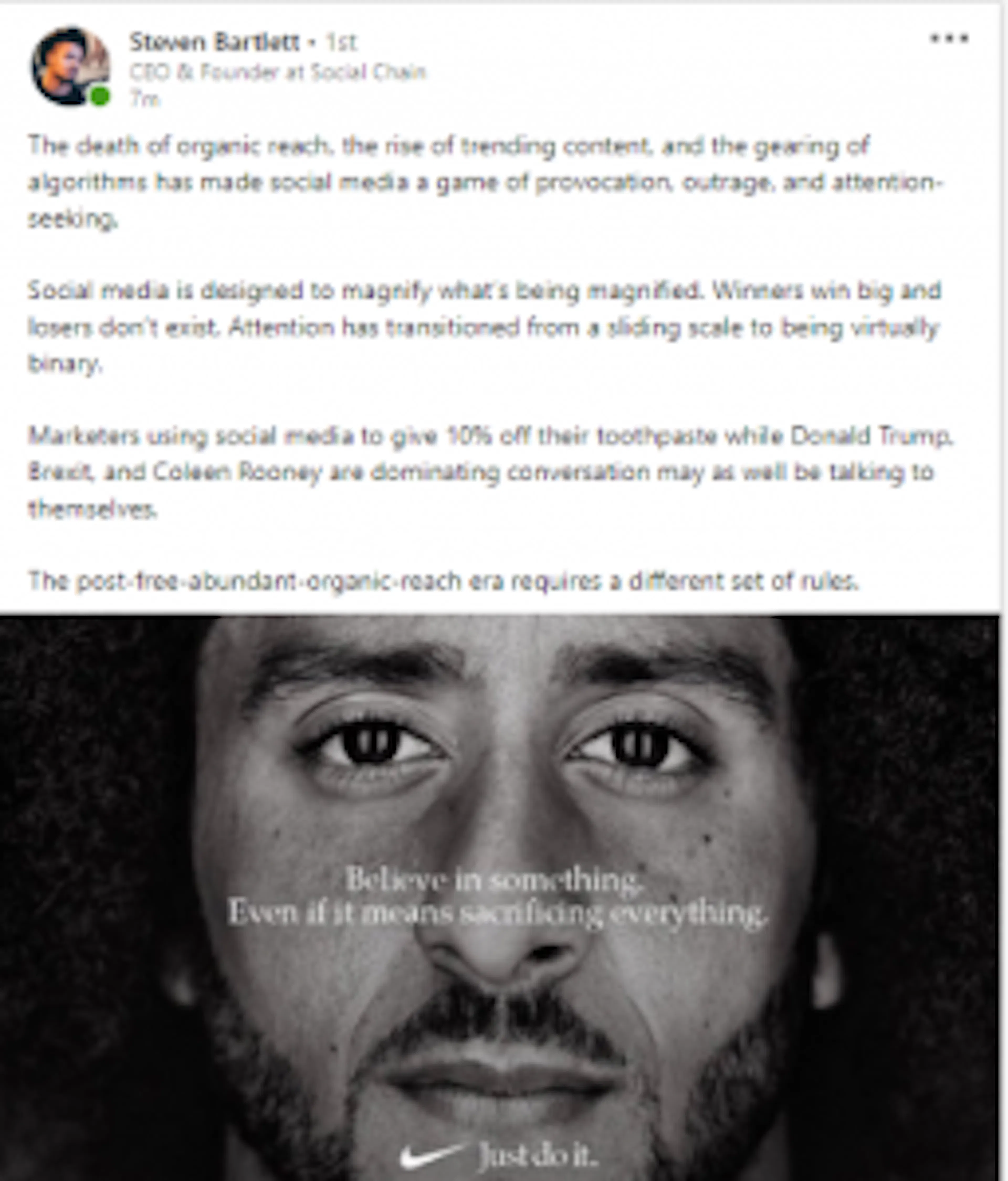 We're a big fan of Steven Bartlett here, and he's hit the nail on the head with this piece on LinkedIn. As organic reach drops, and it's becoming harder to be seen by your audience without paying for advertising, are we having to become more controversial? Authenticity is the key for social media, and it's something that your audience will engage with, understand and appreciate - but when you're battling with algorithms it can be tempting to try other methods to dominate the conversation. Was it always this way, or has social media magnified our means of communication? Honest marketers are being shouted down by contentious content - how do we stay ethical and authentic?
