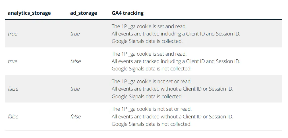 Google Analytics 4 (GA4) will continue to track events with or without consent, utilising both analytics_storage (tracking) and ad_storage (Google signals) configurations, but depending on what the user consents to, depends on what data is collected in GA4.