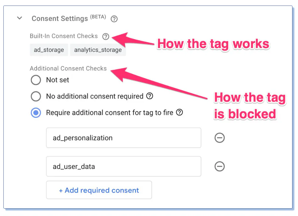 Source:Consent Mode V2 For Google Tags | Simo Ahava's BlogAllowing greater control over the behaviour of other Google and third-party tags, GTM Consent Mode can be implemented through built-in consent checks (dependent on the tag template), which outline how the tag works through the ad_storage and analytics_storage configurations.Additional consent checks list consent states that need a granted status for a tag to fire, allowing you to apply the ad_user_data and ad_personalisation configurations introduced in Google Consent Mode v2.